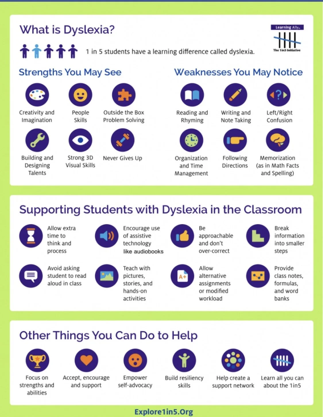 Continue to learn more about what dyslexia is and how you can support your child in the classroom and throughout everyday life. The image on the right by Learning Ally does a nice job of giving suggestions in this area and there are many other great resources to look into when you’re ready.